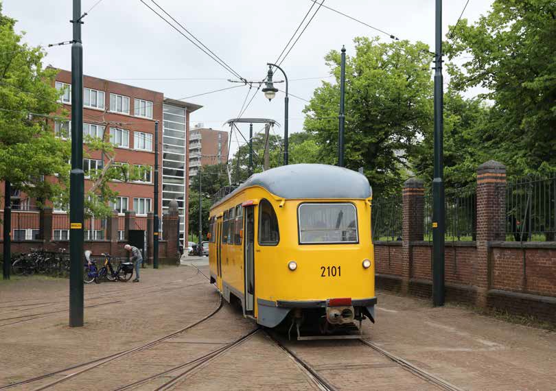 De slechts zelden zichtbare voorzijde van een 2100. Museumwagen 2101 tijdens rangeerwerk op het terrein van het Haags Openbaar Vervoer Museum. | 02-06-2024