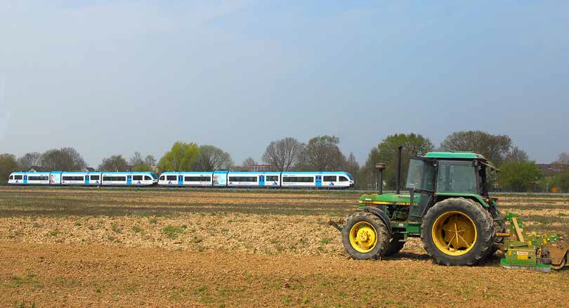 Twee stellen in de Breng-dienst tussen Arnhem en Doetinchem in het landelijke gebied ten westen van Doetinchem, nabij de halte Doetinchem De Huet. | 24-04-2015