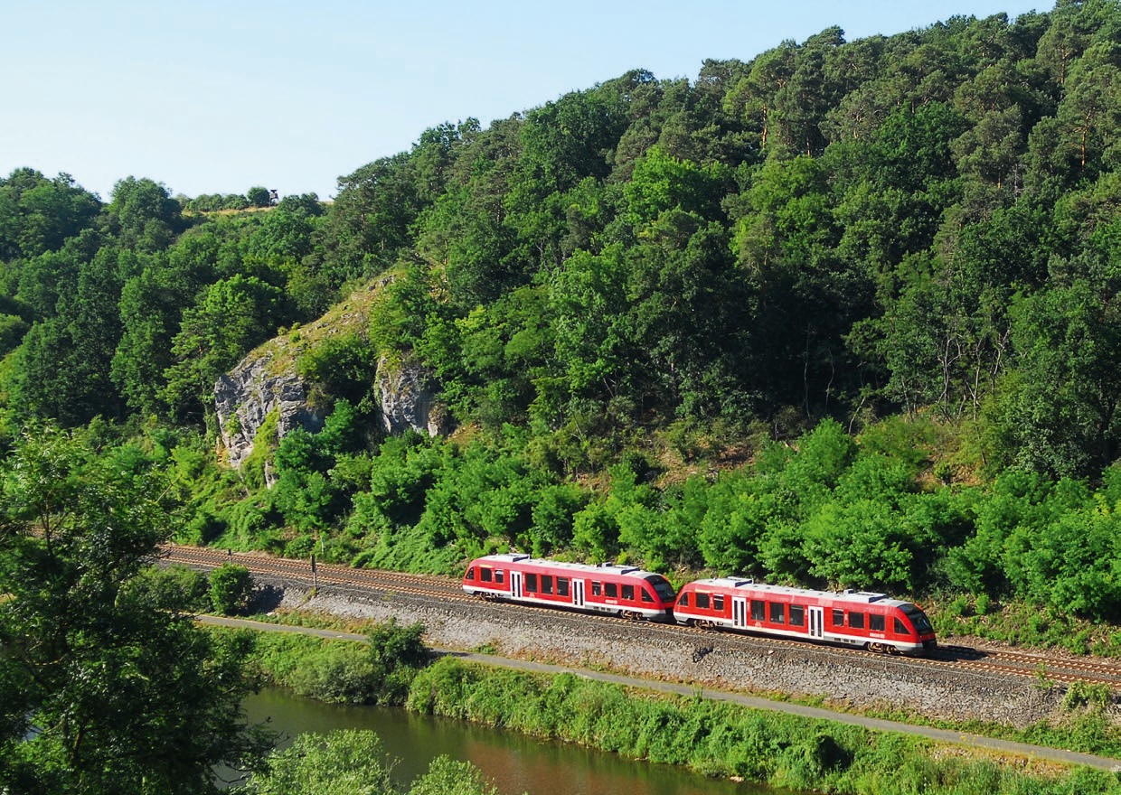 De motorwagens Lint27 gelden als stamvader van de Lint-familie. Twee Lint 27-motorwagens Baureihe 640 passeren op de Lahntalbahn het König-Konrad-Denkmal bij Villmar. | 10-07-2015