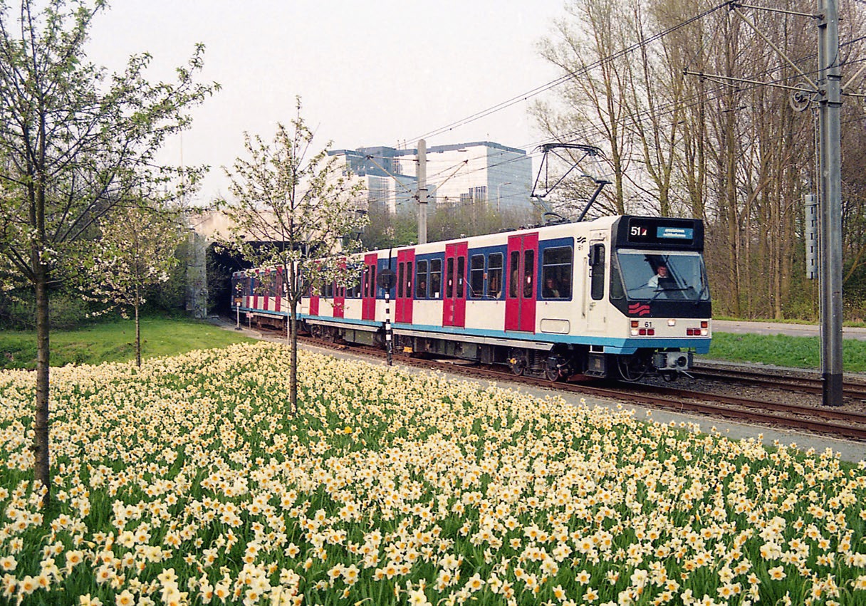 Stel 61 in de boog van station Zuid naar de Buitenveldertselaan. Duidelijk zichtbaar zijn de neergeklapte treeplanken onder de lichtblauwe band. | 22-04-1994