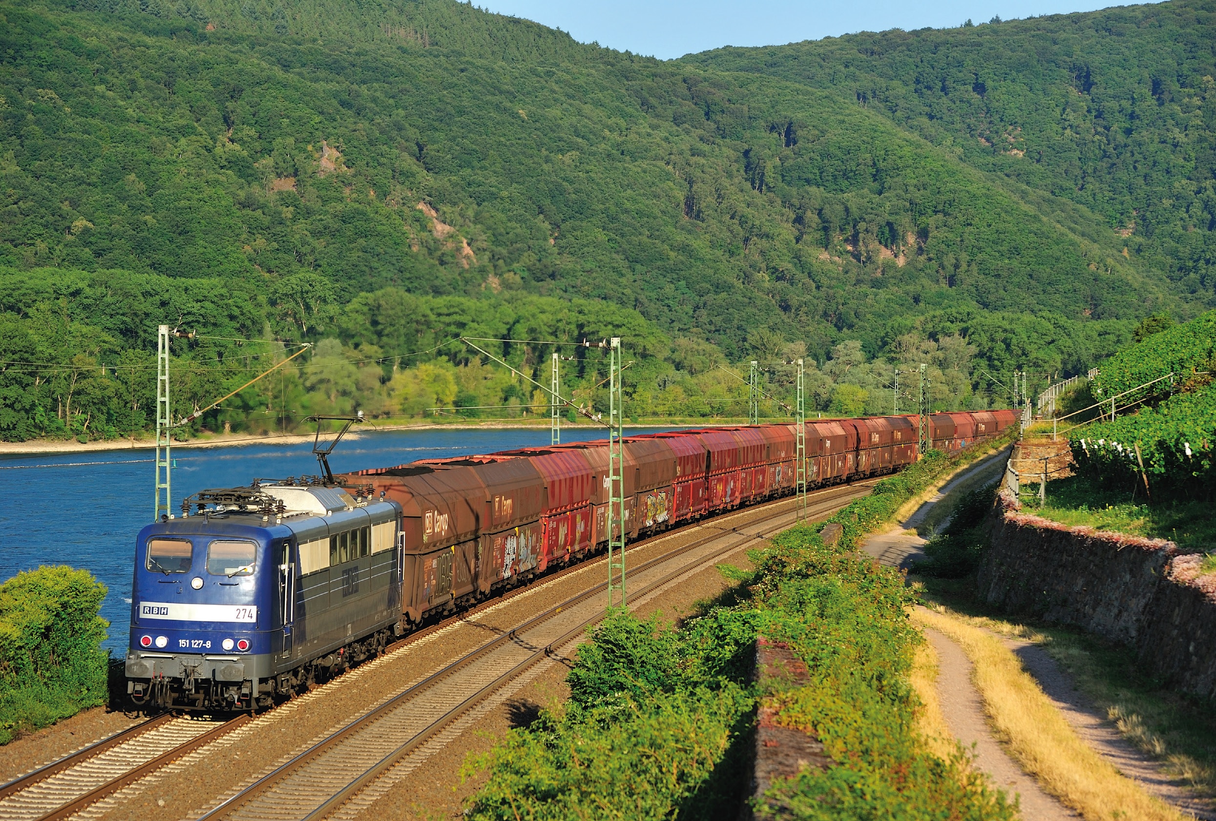 DB-dochterbedrijf RBH Logistics heeft een aantal locomotieven Baureihe 151 in gebruik, die deels in de eigen huisstijl zijn gebracht. Locomotief 151 127 (RBH 274) is met een beladen kolentrein onderweg bij Rüdesheim am Rhein. | 03-07-2014