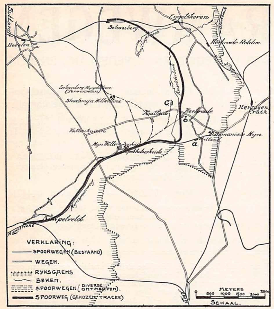 Varianten voor de aanleg van de spoorlijn Schaesberg – Simpelveld; a = Nulland, b = Kerkrade, c = Kaalheide.