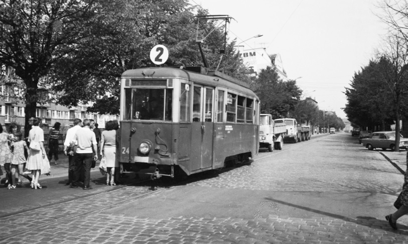 Grudziądz. Het tijdelijke eindpunt van de toch al korte lijn 2 met motorrijtuig 24, ontdaan van zijn op de laatste wisselplaats achtergelaten bijwagen. | 05-08-1975