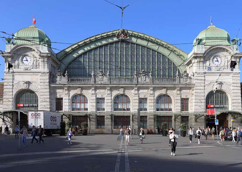 Vooraanzicht van het karakteristieke ontvangstgebouw van Bahnhof SBB uit 1907. De plannen voor de middellange en lange termijn zijn er mede op gericht de grote drukte bij dit station te spreiden. | 07-07-2023