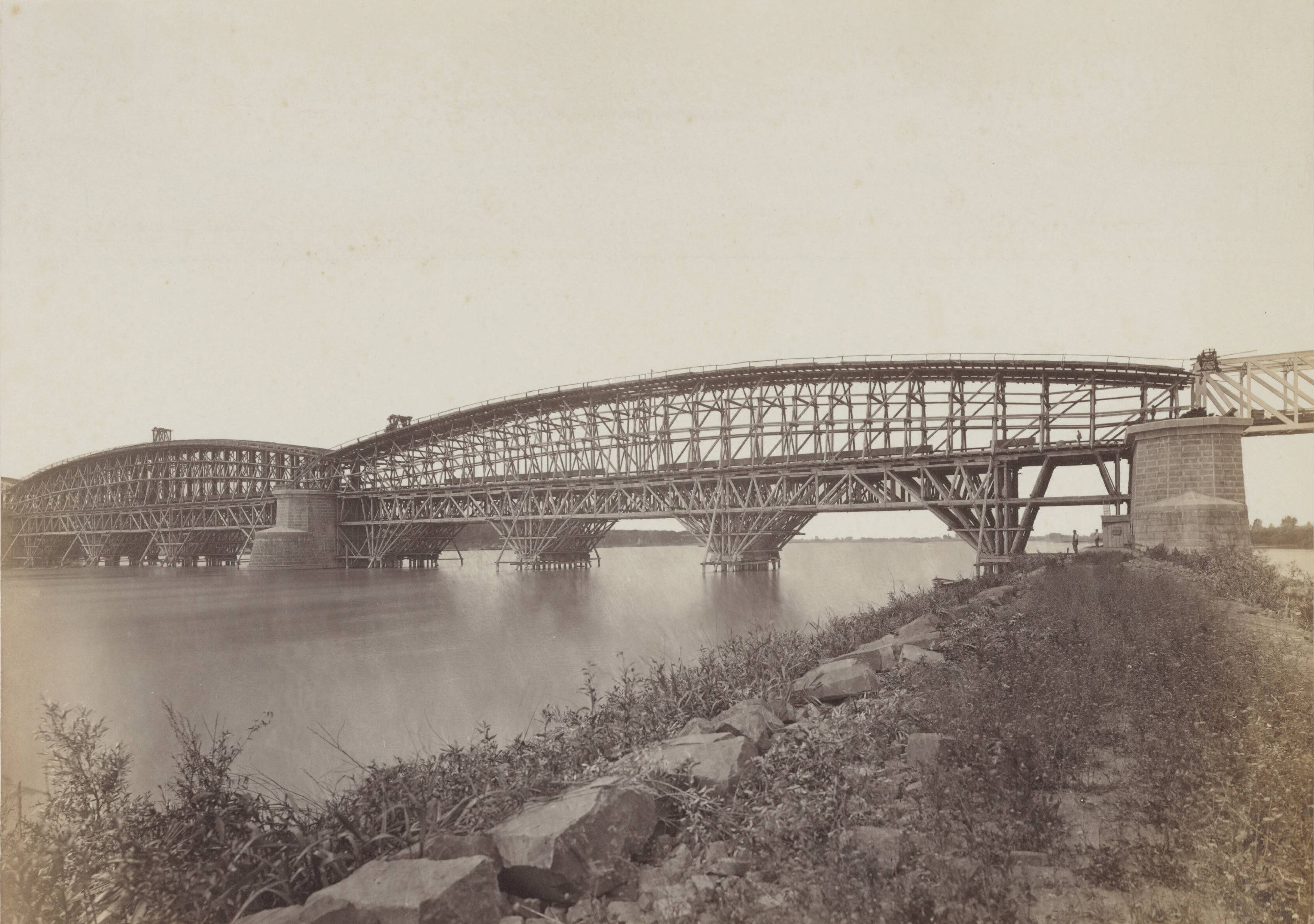 Houten steigers tijdens de bouw van de spoorbrug bij Zaltbommel. | 19-06-1869