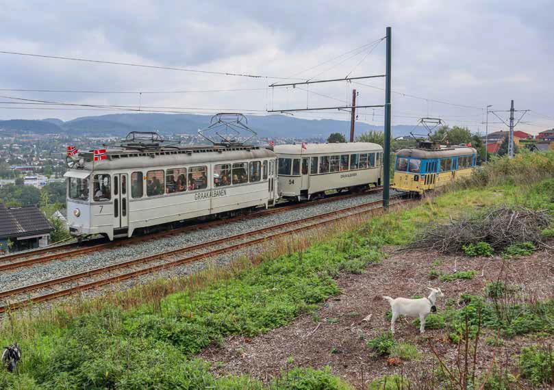 Tijdens de honderdste verjaardag werd een intensieve dienstregeling gereden met historisch materieel. Vlak voor de halte Nordre Hoem kruisen GB 7 en bijwagen 54 het pad van TS 22. Als de lijn de stad uit klimt, biedt deze een prachtig uitzicht over Trondheim. | 01-09-2024