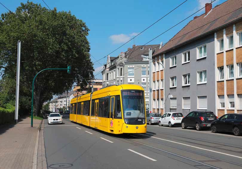 De nieuwste materieelgeneratie van de Ruhrbahn bestaat uit twee series Flexity Classic van Bombardier en Alstom. In Essen liggen de sporen van lijn 108 naar Altenessen op het noordelijke gedeelte van het traject klassiek in de straat. | 23-08-2023