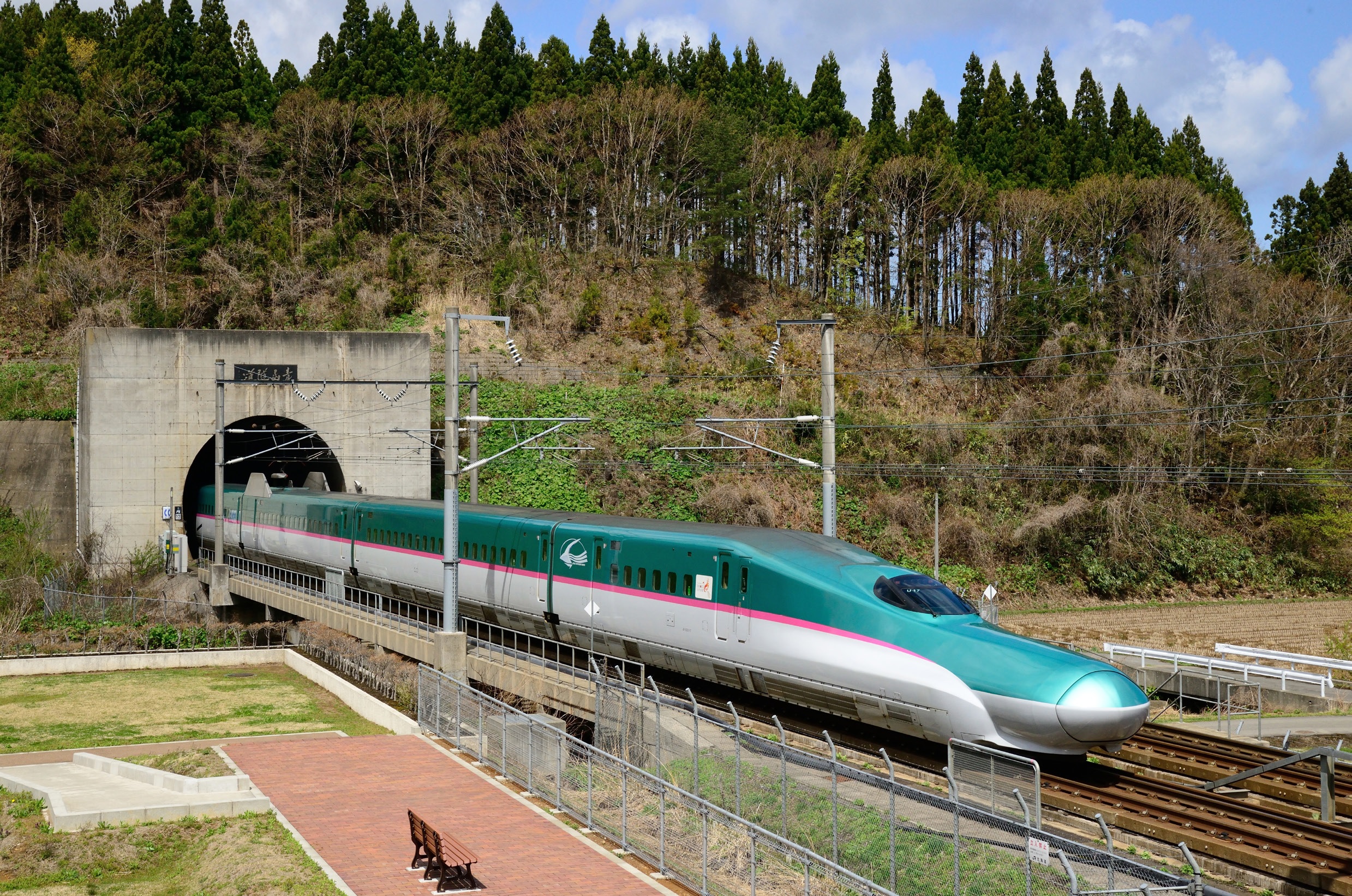 Treinstel JR-East U17 rijdt de Seikan Tunnel in als trein Hayabusa 1 naar Shin-Aomori. Deze tunnel verbindt het hoofdeiland van Japan, Honshu, met het noordelijk gelegen eiland Hokkaido. Het traject is drierailig: 1067 mm voor goederentreinen en 1435 mm voor de Shinkansen. Bij de ingang van de tunnel is een uitzichtplatform: ‘Seikan Tunnel Park’. Imabetsu – Kurosaki Hamana, 27 april 2017. Foto: Ernst van Gulden.