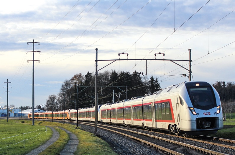 De voor de Schweizerische Südostbahn gebouwde treinstellen RABe 526 001, 002 en 103 vertegenwoordigen het actuele gezicht van de ‘Flirt’-familie. Erlen, 1 december 2018. Foto: Kevin Puppato.