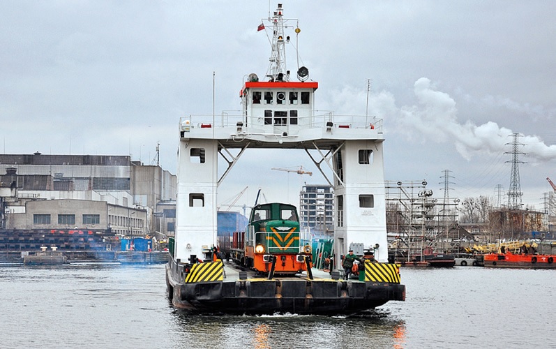 In 2014 kwam de treinveerdienst over het Kanał Kaszubski in Gdańsk weer in bedrijf. Op 12 januari 2016 heeft veerpont Ostrów-1 een rangeerlocje type 401Da en twee goederenwagens opgehaald bij de scheepswerf op het eiland Ostrów. Foto: Thomasz Borys.