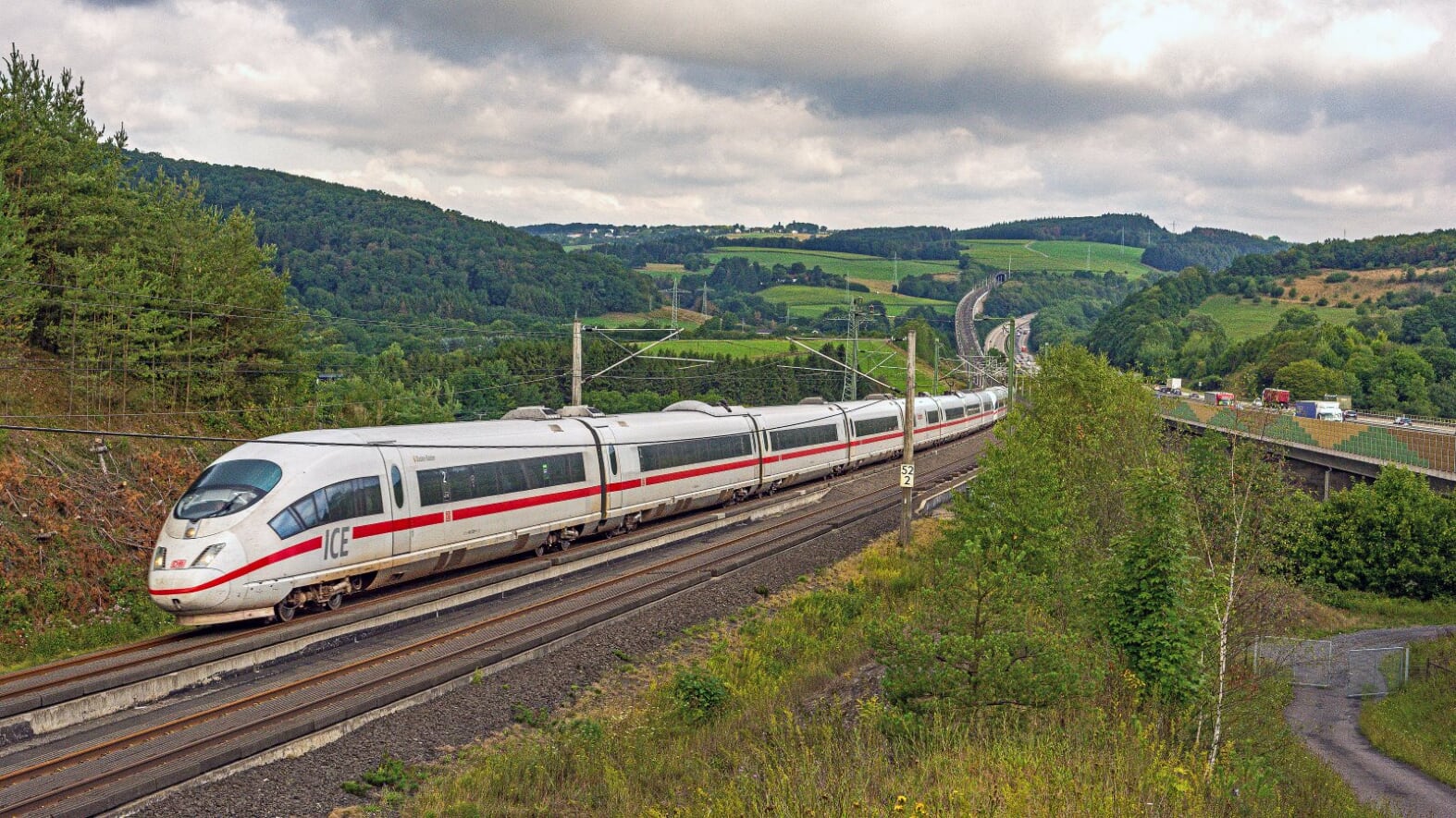 Op 13 augustus 2019 passeren ter hoogte van Neustadt, langs de Autobahn A3, met zo’n 300 km/uur de stellen 403 035 en 403 533 als ICE 815 van Dortmund Hbf naar Frankfurt am Main. Foto: Rob Dammers.