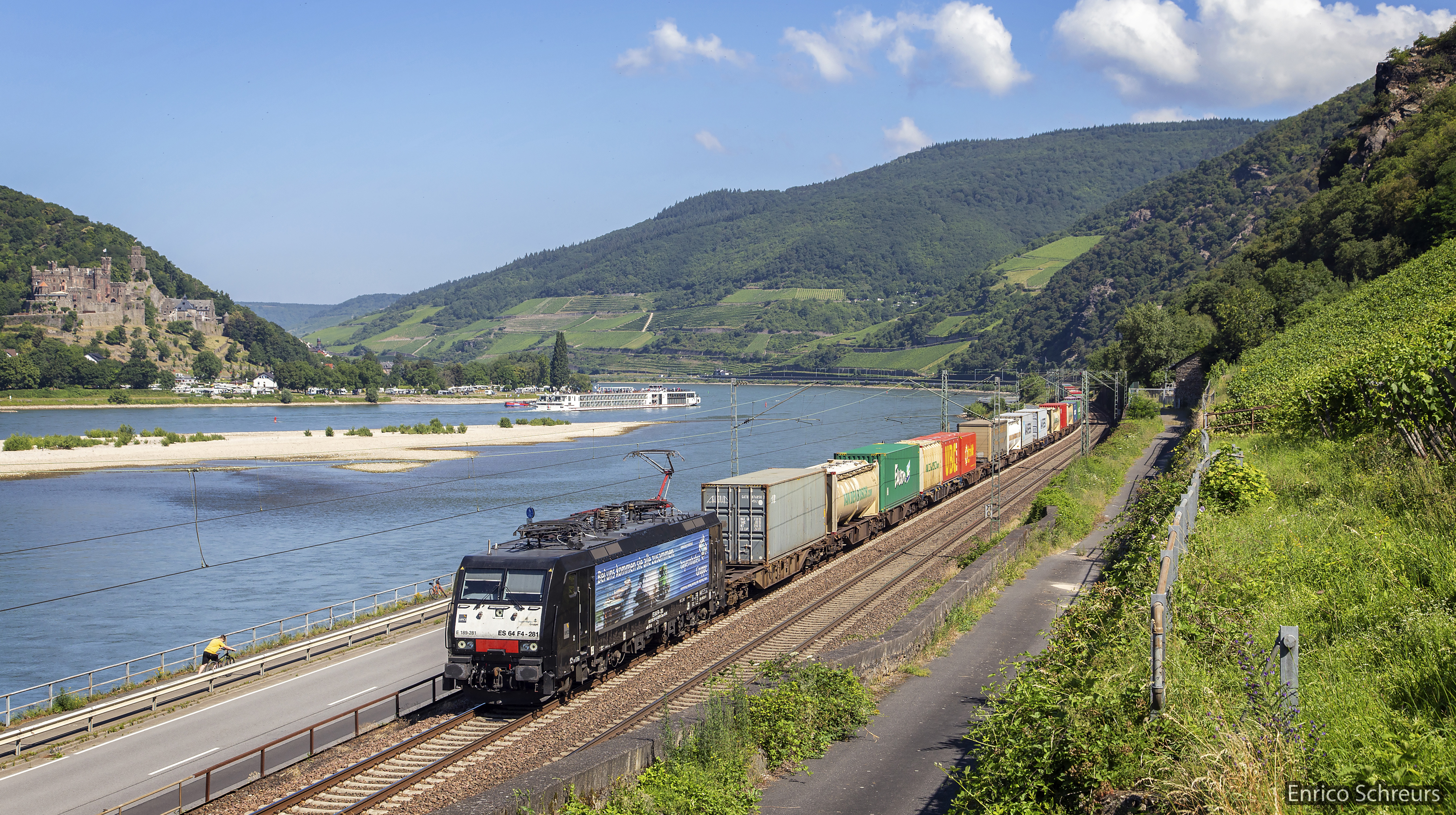 Loc 189 281 van TX Logistik maakt met de München-shuttle een reisje langs de Rijn. Assmanshausen, 27 juni 2018. Foto: Enrico Schreurs.