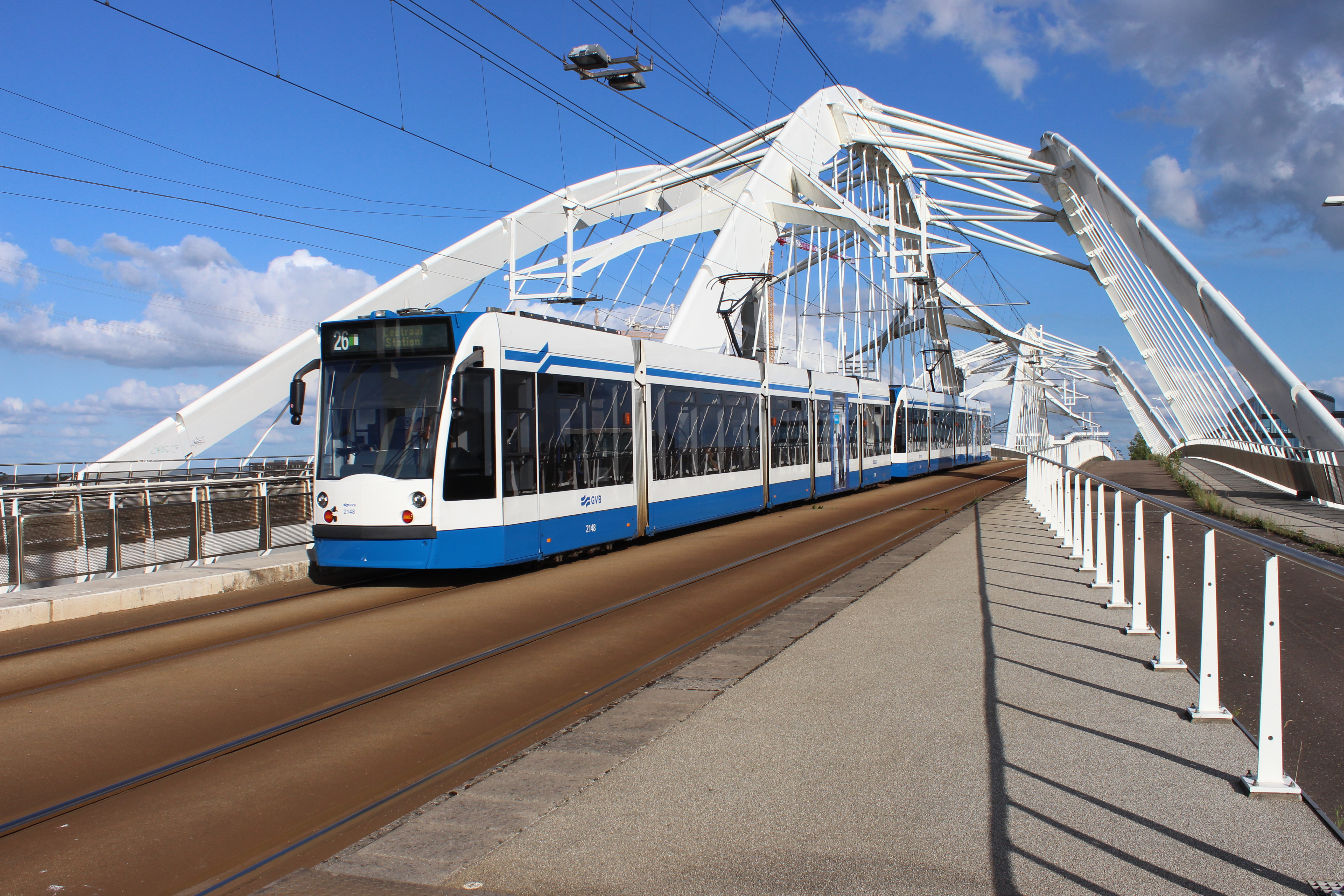 Sinds kort rijden in Amsterdam op lijn 26 als proef twee gekoppelde trams. Op 20 juli 2020 was de 58,4 meter lange combinatie op de Enneüs Heermabrug onderweg van IJburg naar het Centraal Station. Foto: Rob de Haan.