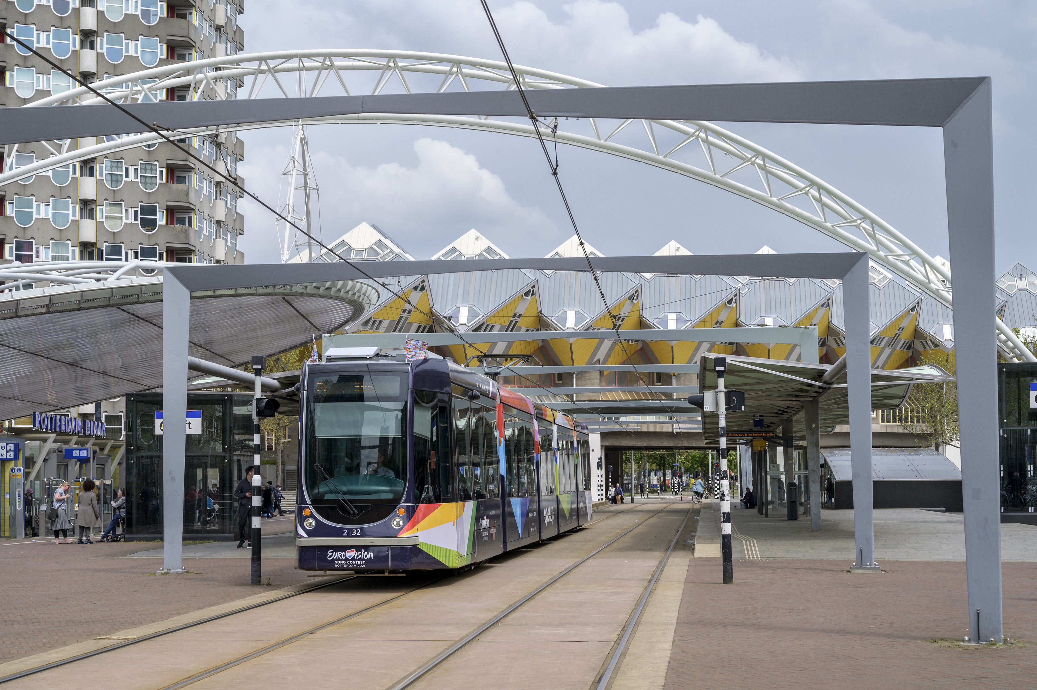 Rotterdam, 11 mei 2021. RET-tram 2132, in de kleuren van het Eurovision Songfestival, halteert bij NS-station Blaak. Foto: Paul van Baarle.
