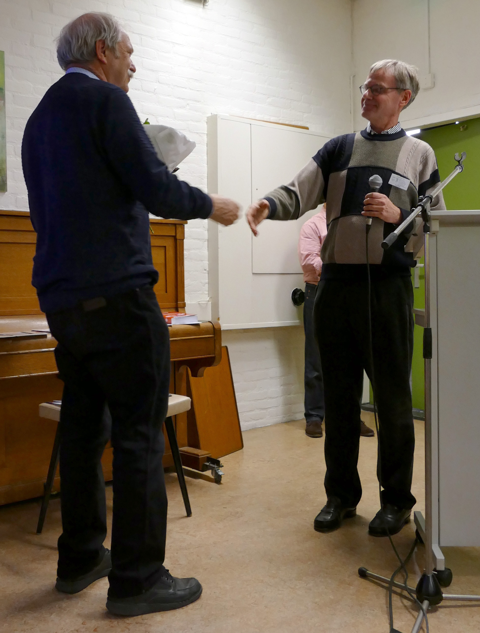 De afdeling Den Haag heeft over bezoek nooit te klagen. In de jaren 2016, 2017 en 2018 werd het bezoekersaantal van 1000 overschreden. Dus lijkt het in de lijn der verwachting te liggen dat dat in 2019 ook wel weer zou gebeuren. Maar zo simpel liggen de feiten soms niet. Het aantal mogelijke bezoekmaandagavonden is namelijk geen constante, maar afhankelijk van hoe Pasen, Pinksteren en Koningsdag vallen. In 2019 was het aantal mogelijkheden slechts minimaal, namelijk 19. Alleen met een gemiddelde van 53 bezoekers per avond zou de 1000 gehaald kunnen worden. Gedurende het hele kalenderjaar schommelde het gemiddelde-tot-dan-toe rond de 53. De spanning bleef dus bestaan tot op het laatste moment, toen duidelijk werd dat op de laatste avond van het jaar de 55e binnenkomer – áls die er al zou zijn! – tevens de 1000 zou volmaken. U begrijpt het al, dat gebeurde inderdaad! Nummer 55/1000 schoof aan in het rijtje bij de entree, maar wat gebeurde er vervolgens?: Hij liep door om eerst een bekende in de zaal te begroeten. Nummer 56/1001 schoof door, en dreigde de positie over te nemen. Slechts ingrijpen door de penningmeester (“Kom terug, teken eerst even in!”) kon de beoogde nummer 1000 nog ‘redden’… Het eindresultaat van 2019: In totaal 1010 bezoekers, verdeeld over 184 verschillende personen, die gemiddeld dus ruim vijf maal aanwezig waren. En wie was dan de nummer 1000?: Paul Koster uit Den Haag. Een cadeaubon van de NVBS-winkel, een bos bloemen en een stevige handdruk van afdelingsvoorzitter Paul Muré waren zijn deel.