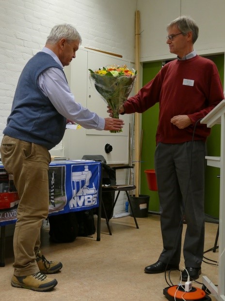 Voordat aan de geplande presentatie over Amerikaanse Interurbans werd begonnen, werd er natuurlijk tijd ingeruimd om aan het bereiken van alwéér een duizendtal de nodige aandacht te besteden. Afdelingsvoorzitter Paul Muré sprak Wim Veerman toe en overhandigde hem een cadeaubon van de NVBS-winkel en een kloeke bos bloemen. De bijgaande foto laat een en ander zien. |