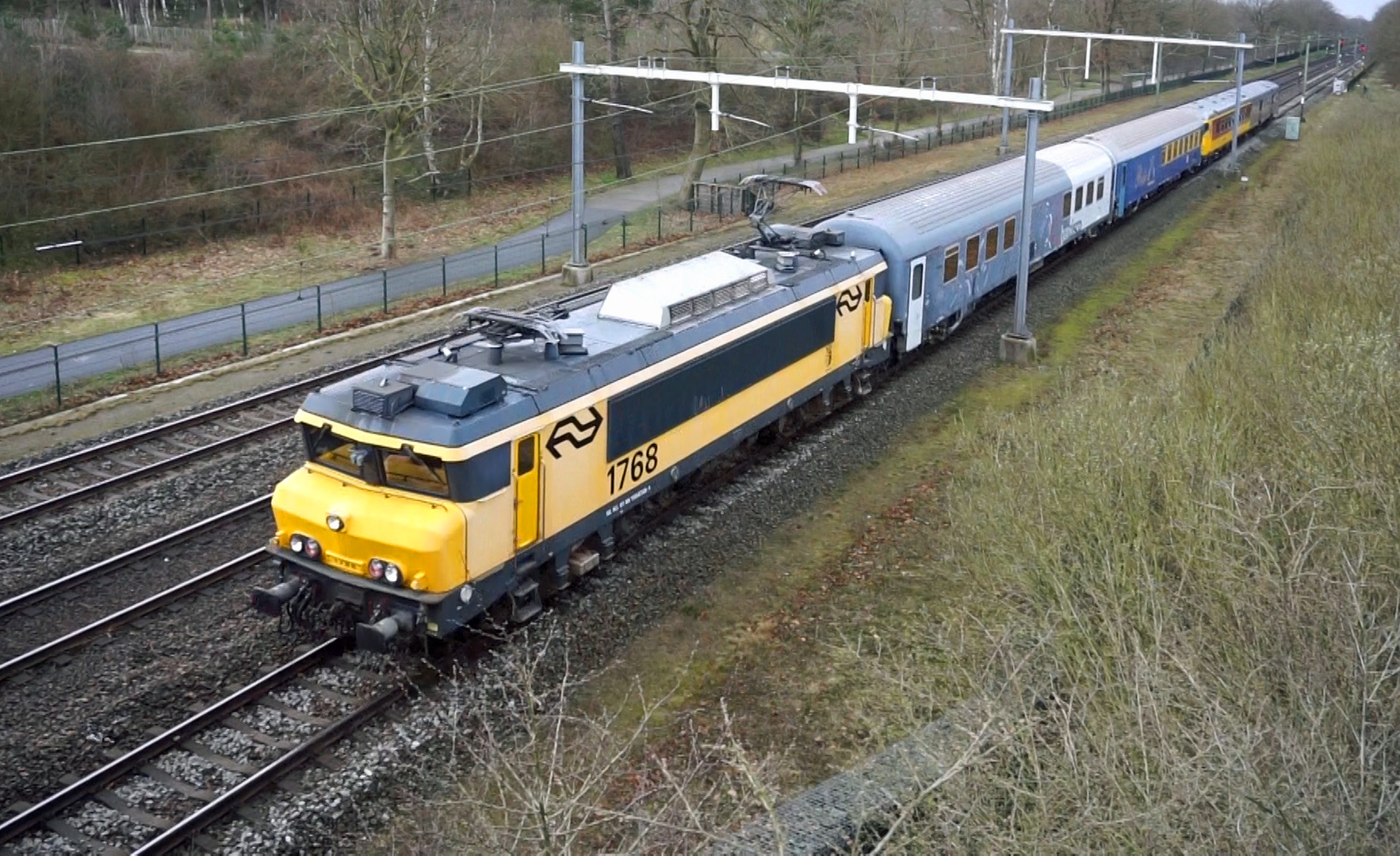 Den Dolder, 13 maart 2021. Vanaf het ecoduct zien we loc 1768 van het Spoorwegmuseum met drie restauratierijtuigen die terugkeerden naar Duitsland. Foto: Jan Post.
