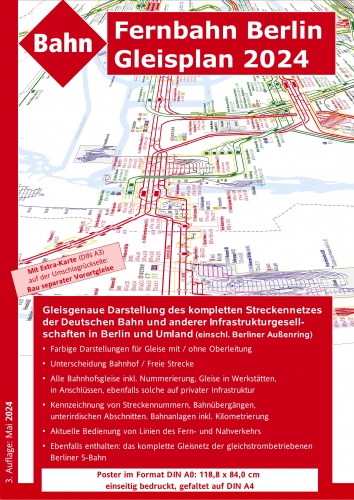 Een gedetailleerde kaart met alle hoofdspoorlijnen in en rond Berlijn inclusief de buitenring en S-Bahn. Afmeting A0 (118,8 x 84,0 cm), gevouwen tot A4.