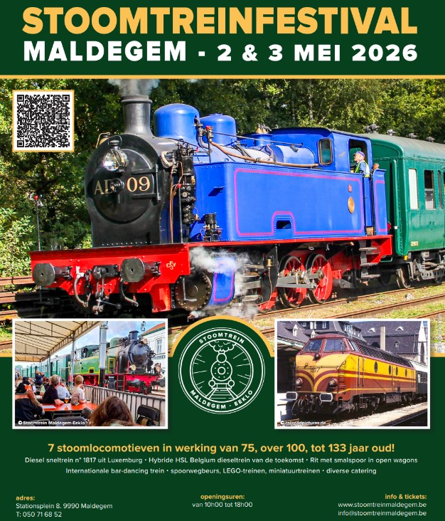 Het jaarlijkse grote stoomtreinfestival bij de Stoomtrein Maldegem-Eeklo. Meerdere stoomlocomotieven in werking. Bezoek van 75 jaar oude Belgische stoomlocomotief AD.09 van CFV3V Mariembourg. Bezoek van stoomlocomotief ‘Tom’ van Hoogovens Stoom IJmuiden. Hoofdlijndiesellocomotief 5508. Uit eigen collectie: viering 100 jaar stoomlocomotief ‘Bébert’. Expositie van divers spoorwegmaterieel. Rij zelf mee met de stoom- en dieseltreinen naar Eeklo. Ritten met de smalspoorstoomtrein. Spoorwegbeurs, legotreinen, miniatuurtreinen. Diverse cateringmogelijkheden en terras met zicht op de activiteiten. De NVBS is met een informatiestand aanwezig. stoomtreinmaldegem.be