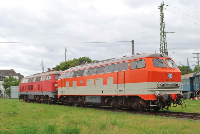 DB-dieselloc 218 137 staat goed fotografeerbaar op het buitenterrein. Foto: Han Duijve.