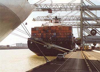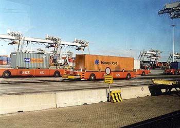 Bij de ECT-poort voegden de organisatoren Martijn Loois en Frits Snelders zich bij de 44 deelnemers, die al snel onder de indruk raakten van de enorme dimensies van de overslag. Jaarlijks worden bijna 4 miljoen containers behandeld op een terrein van meer dan 250 ha. Het transport geschiedt hier deels automatisch met computergestuurde wagens, voorzien van sensoren. Het is grappig te zien dat deze voertuigen keurig richting aangeven als zij afbuigen; voor de weinige chauffeurs op het terrein wordt de rijweg op die manier vroegtijdig bekend, zodat ook zij zonder brokken hun weg kunnen vervolgen.