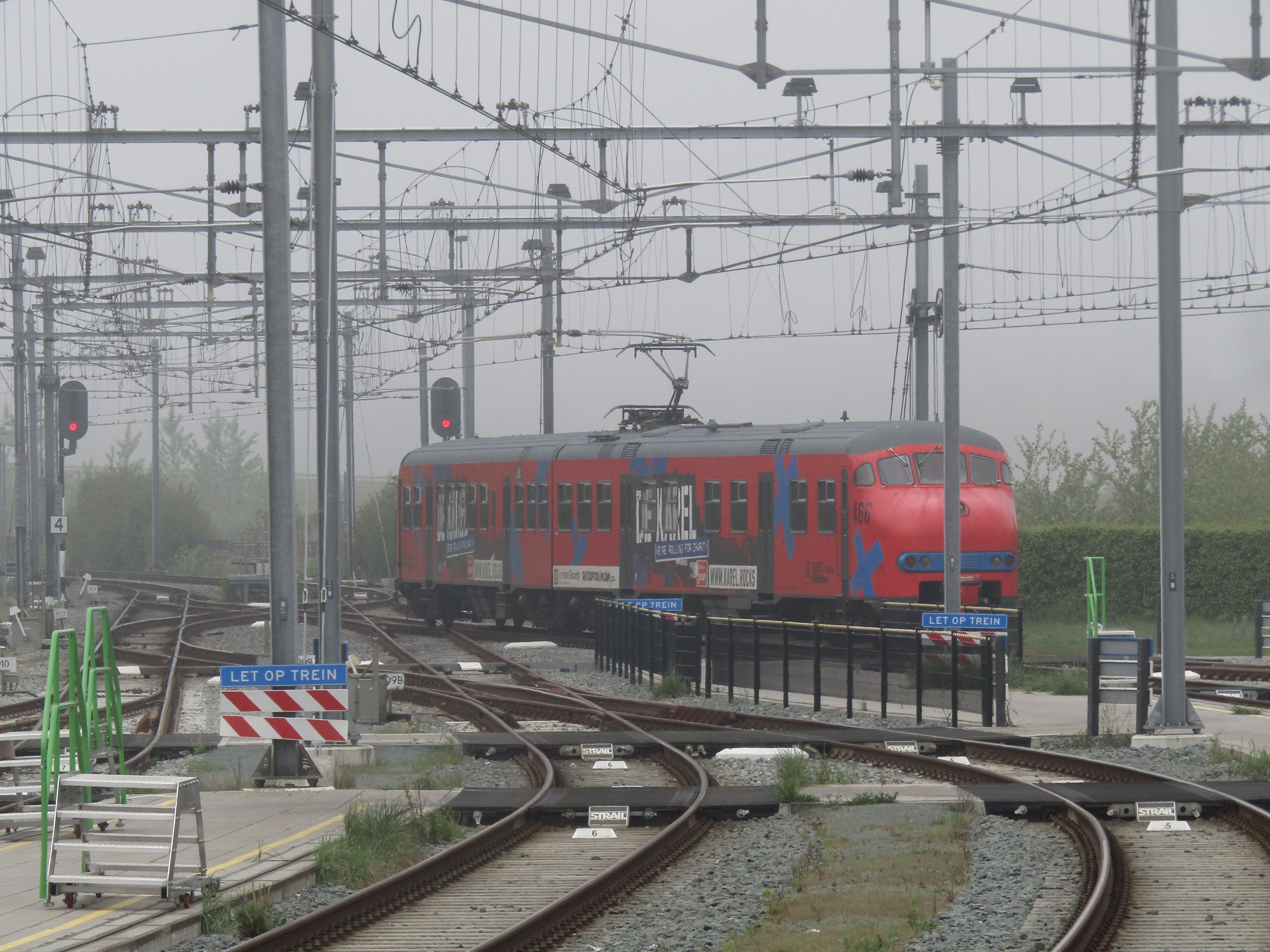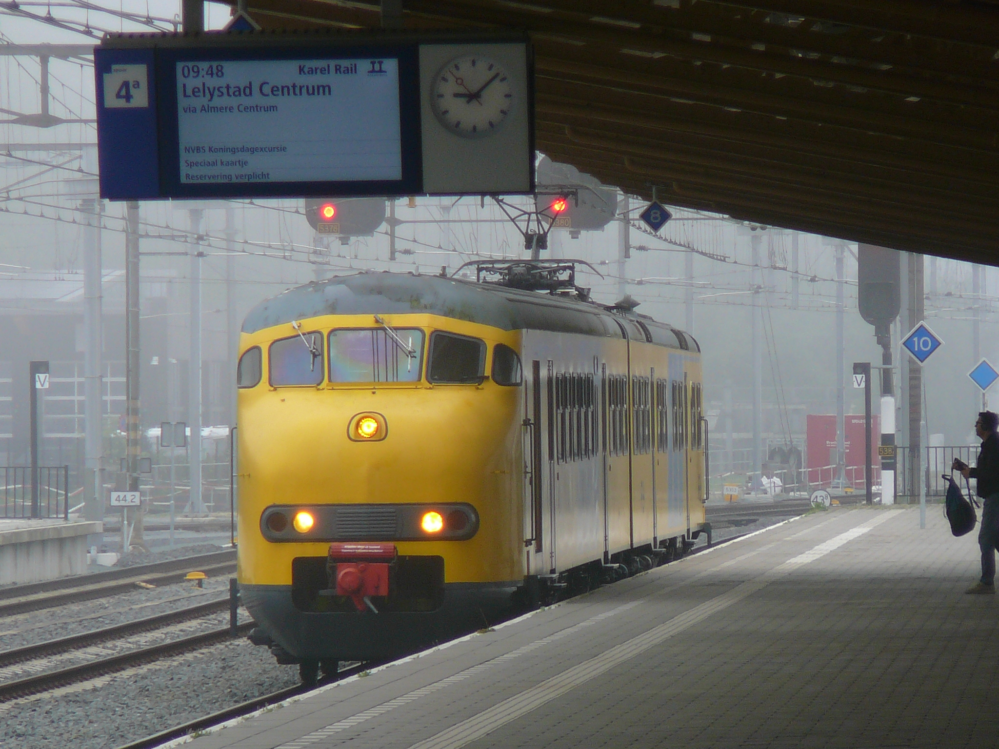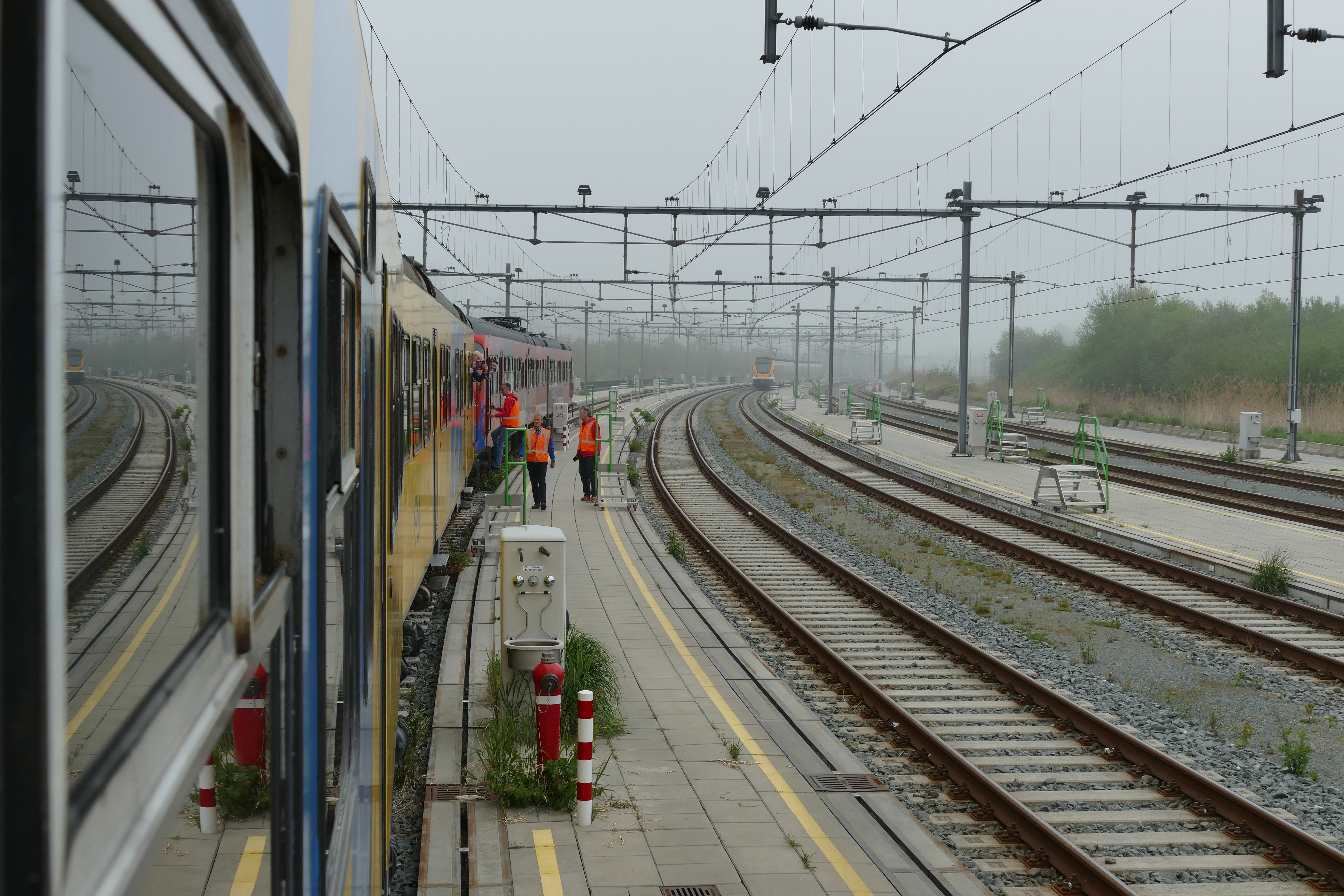 Na het combineren op het spoor langs de mooie oude kap van station Amersfoort ging het onder het genot van koffie, thee en koek via Hilversum en de Gooiboog naar Almere en Lelystad Centrum. Daar koos een deel van de groep voor een foto van vertrek naar Lelystad Opstelterrein en de rest reed mee naar die ongebruikelijke plek voor reizigers. De stellen voelden zich er kennelijk ook wat onzeker, want na het omlopen van De Karel mislukte de koppeling aan de 876. Niet getreurd, dan maar met een half uur vertraging terug in de oorspronkelijke combinatie richting Lelystad Centrum.