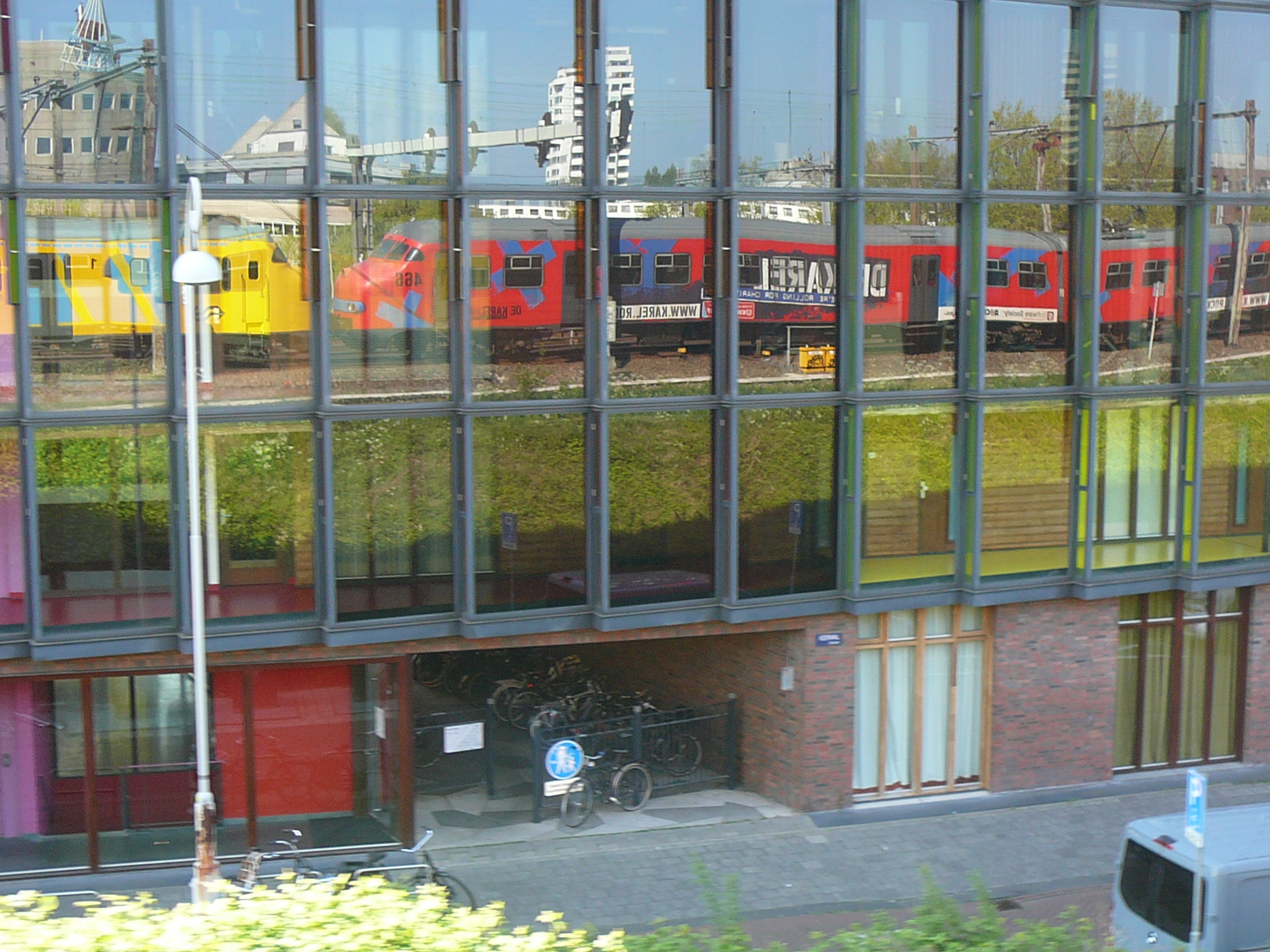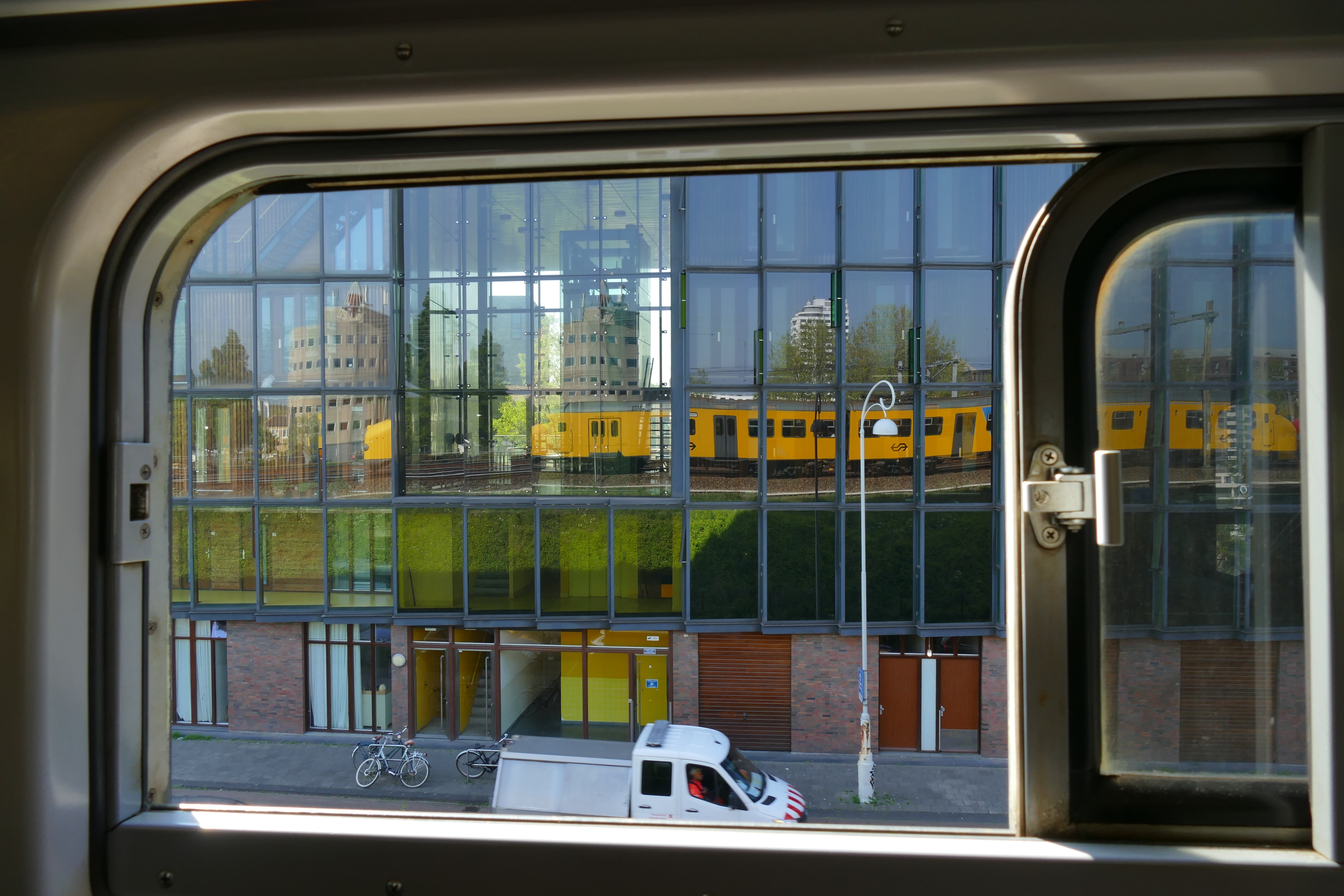 De Karel in spiegelbeeld, gefotografeerd vanuit de 876 bij Amsterdam-Muiderpoort, 26 april 2025. Foto Frank Hoogenboom