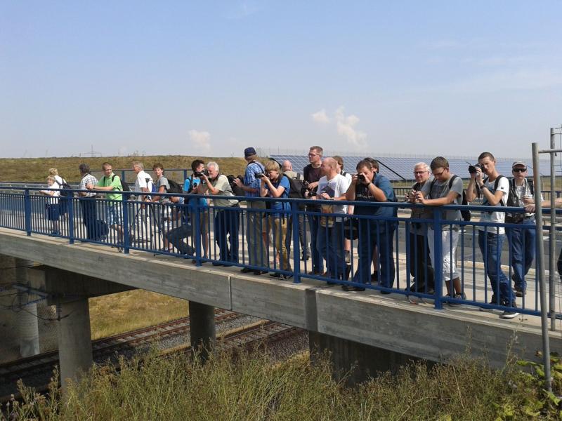 Op het viaduct over de bruinkoolspoorlijn in Buir werd een fotolijn opgesteld om de eerste bruinkooltrein te fotograferen.
