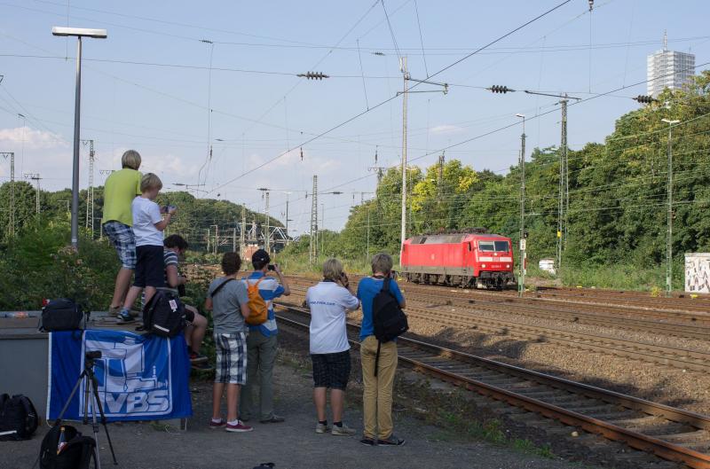 In Köln West was er veel aandacht voor de passerende goederentreinen en de losse 120 106 die kop maakte.