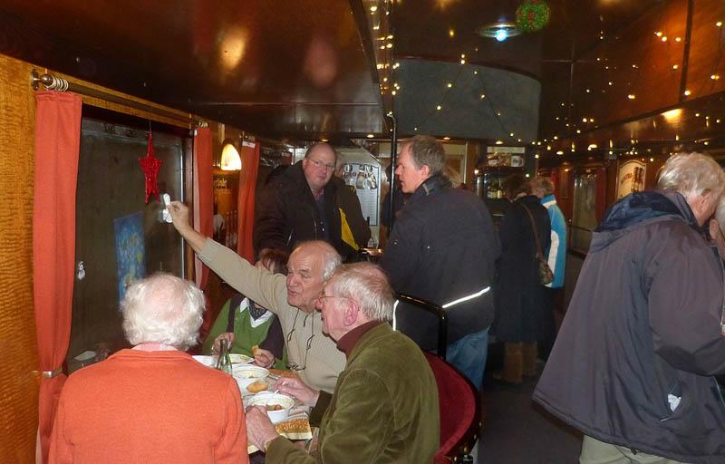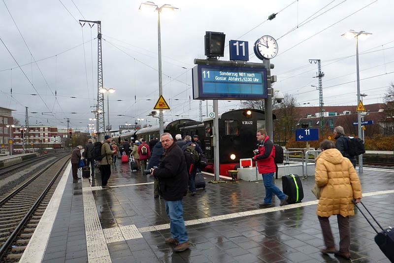 Het was winter, de dagen waren kort en het weer was niet bepaald fraai, maar toch hebben de 53 deelnemers kunnen genieten van een aantal bijzondere ritten. Zo stapten we op donderdag 11 december in Münster in de Teuto-Express van de Eisenbahn-Tradition. Een trein bestaande uit een industrielocje en een drietal rijtuigen, waaronder een restauratierijtuig. Na enig rangeerwerk op het emplacement van Münster, tussen de RE’s en ICE’s door, kwamen we op een afgesloten goederenlijn van de Westfälische Landes-Eisenbahn (WLE) richting Lippstadt. Onderweg werden we vergast op Erbsensuppe mit Wurst und Brot en werden de nodige fotostops gehouden. Daarna ging de reis volgens de normale dienstregeling verder over weinig bereden Nebenstrecken naar Goslar.