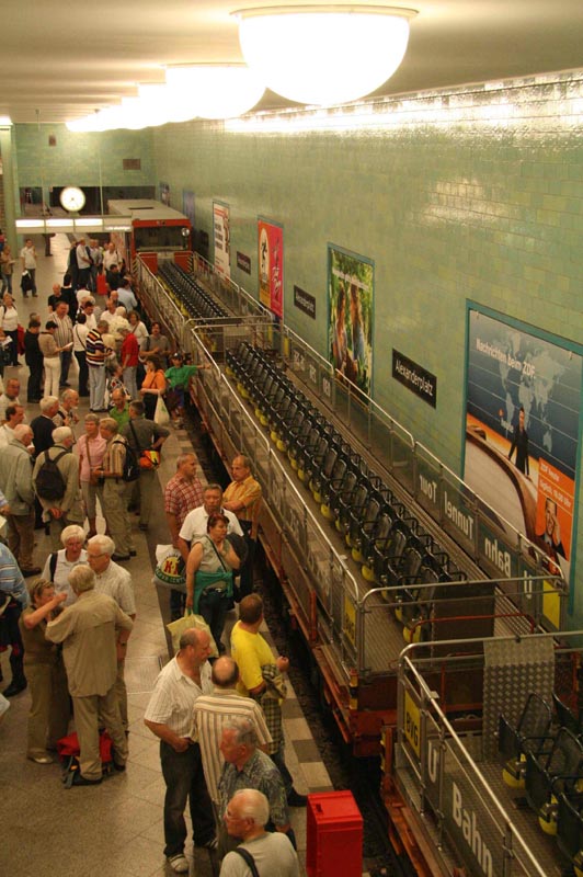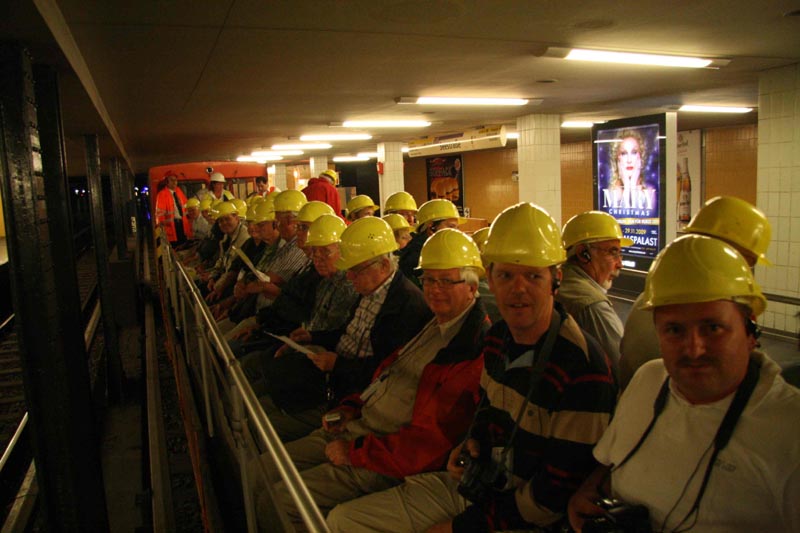 In het weekend dat wij er waren trad een nooddienstregeling in werking. En die bleek nog aardig te werken ook. De dag was nog niet voorbij voor de 43 deelnemers aan de Tunnel Tour Berlin im U-Bahn Cabrio, een rondrit in open rijtuigen door een deel van de tunnels van de U-Bahn. Gründlich deutsch georganiseerd, zowel qua veiligheid (streng toezicht, helm op, niets buitensteken! zitten blijven!) als qua wetenswaardigheden over bouwstijl en niet te vergeten het functioneren van dit bedrijf tijdens de deling van Berlijn. We reden vanaf Berlin Alexanderplatz in twee uur een lus via onder meer Gesundbrunnen, Friedrichstrasse, Stadtmitte, Hermannplatz en Kottbuser Tor tussen de normale dienst door. Dit laatste leverde bij het passeren van de stations soms hilarische taferelen op. Voor de liefhebbers, de open rijtuigen werden getrokken door een accu-locomotief uit 1997. Het waren ten dele lijnen die tijdens de deling van de stad tot het West-Berlijnse net van de U-Bahn behoorden, en dus op halve snelheid de stations die in Oost lagen passeerden, op weg van het ene deel van West-Berlijn naar het andere westelijk deel van de stad.