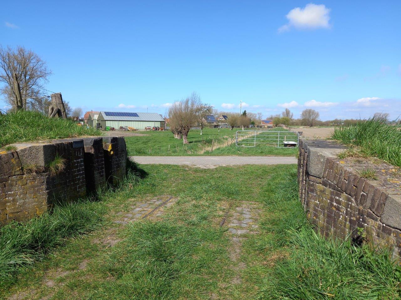Een eerste hoogtepunt van de excursie was de dijkcoupure bij Mauritsfort, die in 2011 in volle glorie was hersteld en waar zelfs een stukje rails in is teruggelegd.