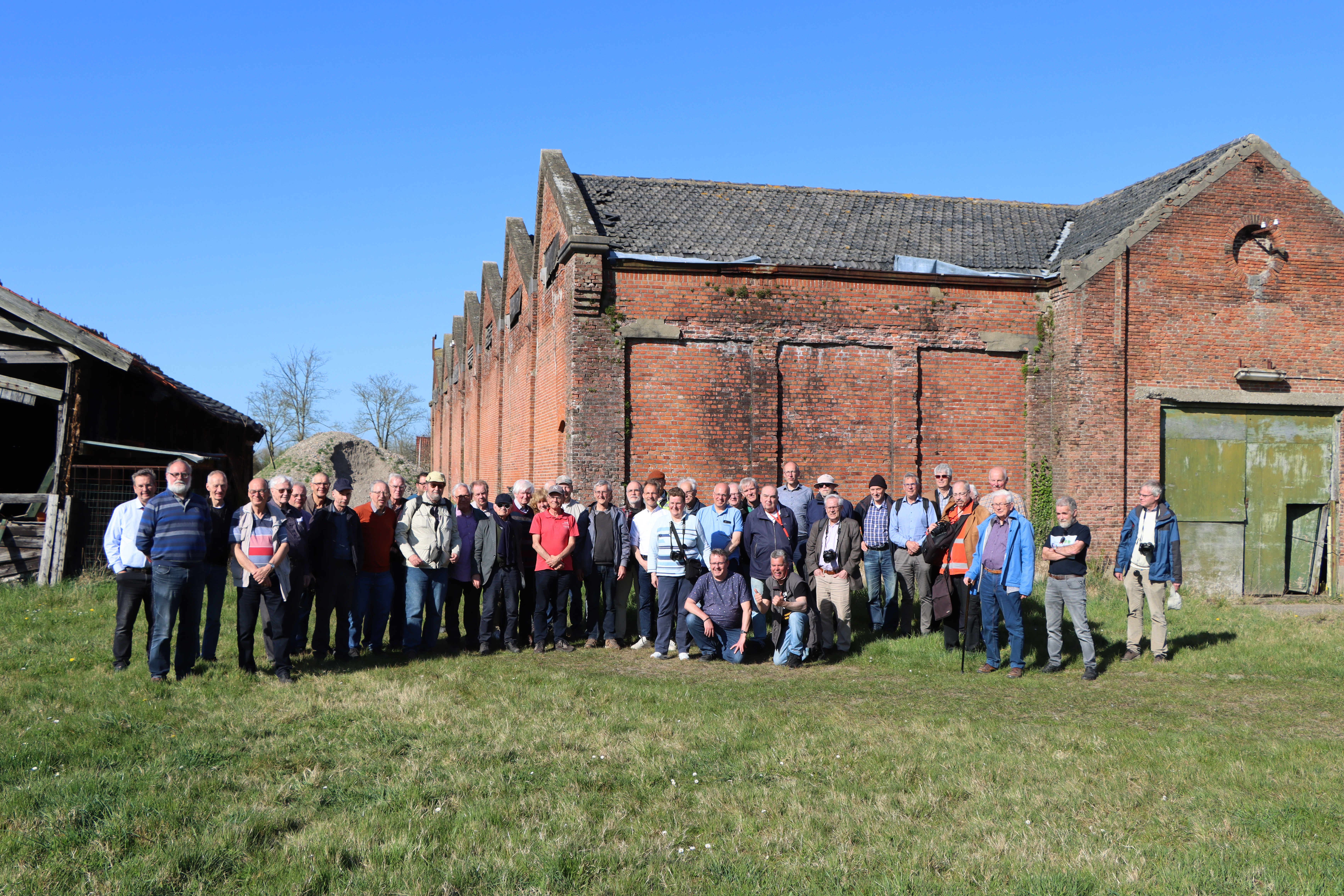 De groep bij de oude SBM-remise annex werkplaats in Draaibrug met als tweede van rechts Theo Buijsse, 5 april 2025. Foto Edwin Voorhaar