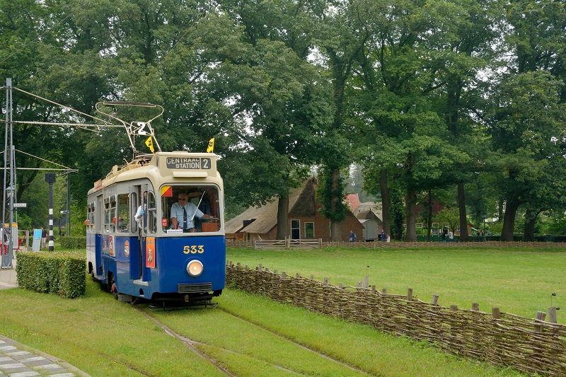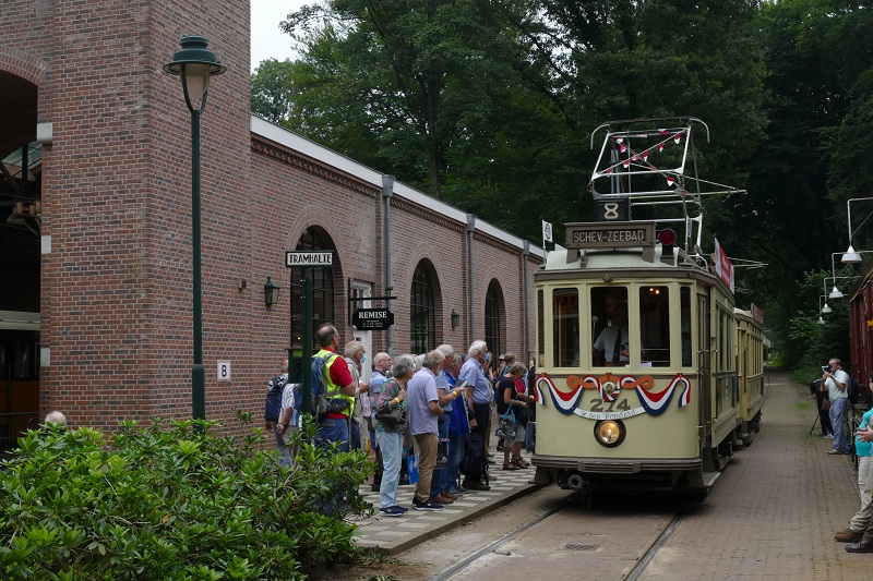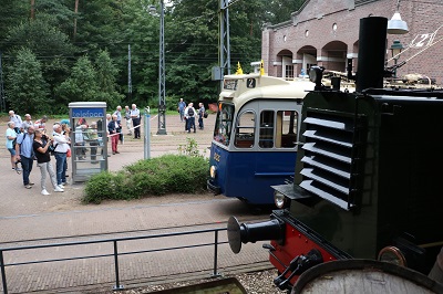 Zestien maanden zonder excursie, trein- of tramevenement, hoe houdt een mens het vol? Aan die lange periode kwam op 24 juli 2021 een einde, toen liefst 230 liefhebbers de weg naar het Nederlands Openluchtmuseum in Arnhem wisten te vinden. Waarschijnlijk hadden zij ook direct ingetekend op een dagje olietankers schoonmaken in de Botlekhaven, want wat is het leuk om weer eens gelijkgestemden te ontmoeten, bij te praten en te hopen dat het evenement de start is van het nieuwe normaal. Zeker: corona is de wereld nog niet uit, maar met die wetenschap valt toch een stuk beter te leven tussen de vele historische trams die slingerend door het park hun meters maken en tot meerijden noden, mét mondkapje – dat nog wel. Speciaal overgekomen uit Amsterdam was de in een blauwe livrei gestoken GVB 533 die in de middag uitsluitend voor de NVBS’ers (herkenbaar aan een bevrijdende blik en een button) zijn rondjes reed. Reguliere bezoekers moesten het doen met de aanblik of met een plaatje. Fotopunten genoeg overigens in Arnhem, zeker ook voor de evenementdeelnemers die na de passage van de drie-asser weer achter menig boom opdoken. De Haagse 274 was vanwege zijn 100-jarig bestaan voorzien van HTM-bijwagen 779 en ook de Amsterdamse railreiniger Rr3 trok veel bekijks. Een andere blikvanger bleek replica 76 van de Arnhemse tram GETA, zeker toen hierin een trouwstoet een rondje reed om bij de trouwlocatie te worden afgezet. Altijd leuk om anderen in het huwelijk te zien treden.