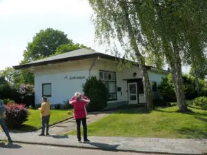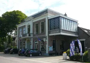 Door dus naar Bolsward over een route die de (goederen)tram nog tot 1968 had gereden. De passage door IJsbrechtum (op eigen baan) konden we nog herkennen. In Nijland bleek de oude wisselplaats met veelading inmiddels geheel vergroend. De route door Bolsward was deels afgesloten wegens festiviteiten. We konden nog net het oude station bereiken dat helaas op de nominatie staat gesloopt te worden. De oude remises waren al vervangen door de onvermijdelijke winkels en appartementen. Na een rondje langs de singel en weer een geopende brug, zetten we koers naar Harkezijl. De oude halte met remise aldaar van de paardentram naar Makkum, als laatste Nederlandse paardentram gesloten in 1930, was nu vervangen door een woning met garage die in de verte aan de oude halte deed denken. In Witmarsum wees Wytze ons de plek waar ooit de paardentram geëindigd was, totdat de problemen met de “moderne” Vignolarails, nodig voor de stoomtram die dezelfde route reed, dat onmogelijk maakte. En zo kwamen we in Arum waar we aanlegden bij de plaatselijke herberg die ooit, in 1876, als halte voor de tram gebouwd was (foto 5). Eigenaresse Roos van der Veen had behalve hapjes en drankjes ook een presentatie over het gebouw en de tram én een rondleiding voor ons in petto. Ze vertelde onder andere dat de stichter van de herberg, Jacob de Rapper, geweten moet hebben van de tramplannen, want hij was al jaren voor de opening van de tramlijn (1882) klaar met bouwen. We namen er graag even de tijd voor, al ging het ten koste van de korte wandeling die bij Hitzum nog op de planning stond.