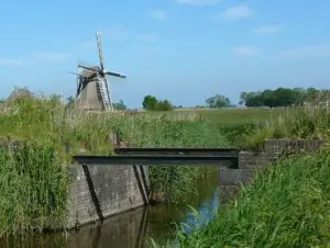 Bij Arum liep de lijn dus rechtdoor naar Harlingen, maar wij volgden op afstand het tracé van de zijtak richting Franeker die in 1902 geopend was en tot vergroting van het emplacement en de watertoren hadden geleid. Onderweg zagen we ook hier diverse oude landhoofden vanuit de bus. Bij één ervan, met fraaie molen op de achtergrond, fotostopten we even (foto 6). Voor de groep van 7 mei stond bij Achlum een aardige wandeling op het programma, die echter na honderd meter al afgebroken moest worden, omdat het (openbare) wandelpad was versperd door een horde koeien en schrikdraad en verderop de weilanden eender afgezet bleken. Het alternatief dat Ronald voor 4 juni achter de hand had, verdween in de extra tijd die we bij het tramhotel in Arum hadden doorgebracht. De herlegde tramkruising bij Hitzum had op 7 mei aanleiding gegeven de groep van 4 juni te verzoeken een inspectie uit te voeren waaruit (inderdaad) bleek dat er nu geen normaalspoor (1435 mm) lag maar smaller spoor van 1270 mm (foto 7). Bij Leeuwarden zouden we er bij de kruising van het Dokkumer Lokaaltje met de Harlingerstraatweg nog eentje tegenkomen die ook nog een traditionele staander van rails had en er ook overigens authentiek half verroest uitzag.