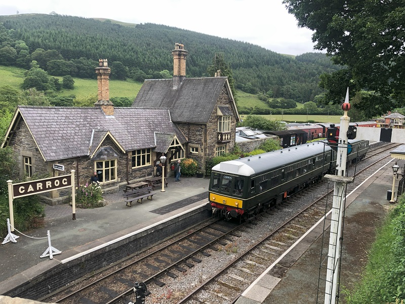 Heritage Railcar 108 51907 op weg van Llangollen naar Cerwen aan het perron in Carrog, 18 juni 2024. Foto: Frans van Sabben.