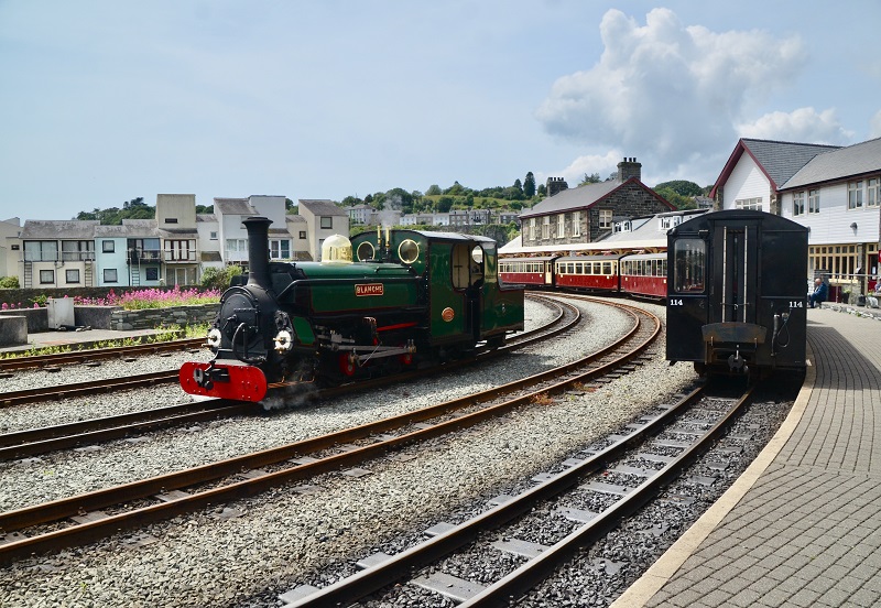 Stoomloc ‘Blanche’ rangeert in Porthmadog naar de trein met bestemming Blaenau Ffestiniog, 19 juni 2024. Foto: Frans van Sabben.