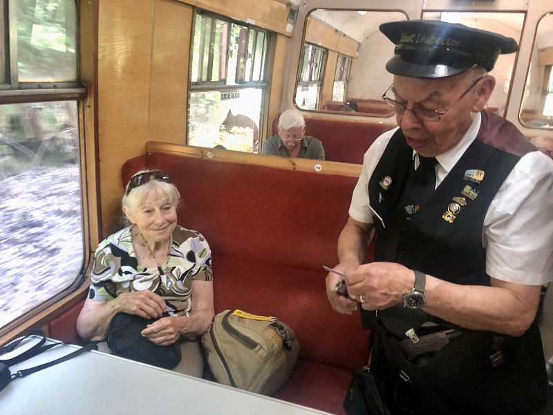 Kaartcontrole in de stoomtrein van de East Lancashire Railway tussen Bury Bolton Street en Rawtenstall, 20 juni 2024. Foto: Frans van Sabben.