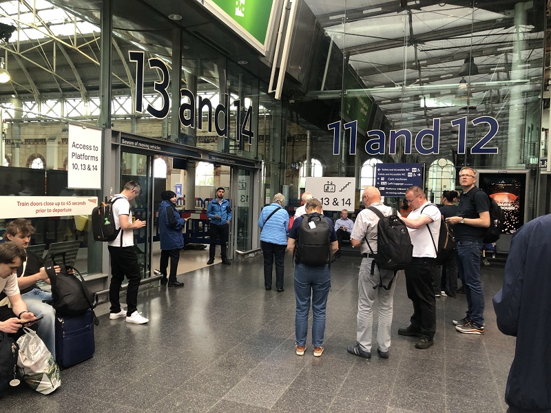 Ingangscontrole in station Manchester Piccadily en NVBS’ers op zoek naar hun Peaks & Rover Pass, 20 juni 2024. Foto: Frans van Sabben.