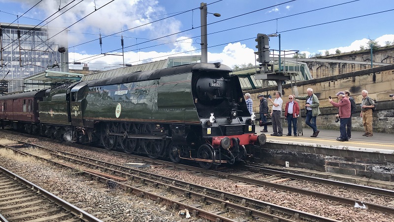 Tangmere 34067 heeft Carlisle bereikt en loopt om voor waternemen, 22 juni 2024. Foto: Frans van Sabben.
