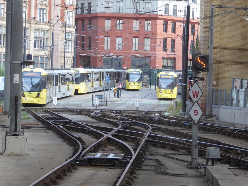Tramdrukte voorbij de wisselstraat aan de zuidzijde van Manchester Victoria, 26 juni 2024. Foto: Rob Zoomer.