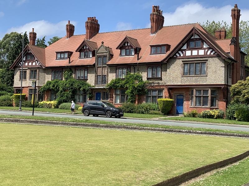 Huizenblok in Port Sunlight voor de fabrieksarbeiders van de gebroeders Lever, onder architectuur gebouwd en ook na een eeuw nog oogstrelend mooi; 23 juni 2024. Foto: Ronald Bokhove.