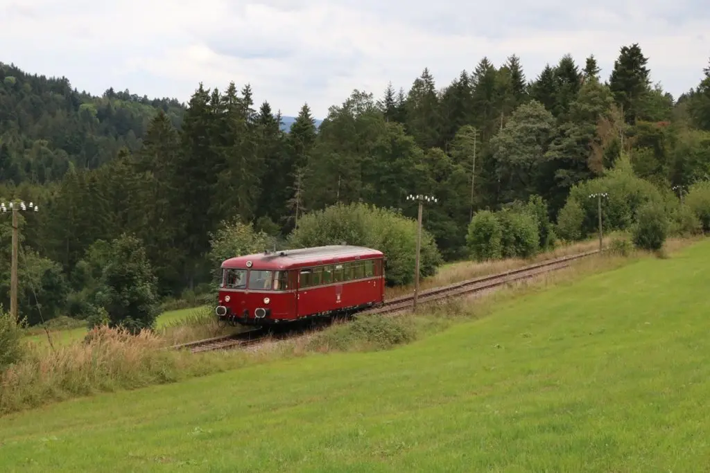 ![]() Dezelfde railbus verderop in het landschap van het Bayerischer Wald, 6 september 2019. Foto: Hans Krijnen. |
