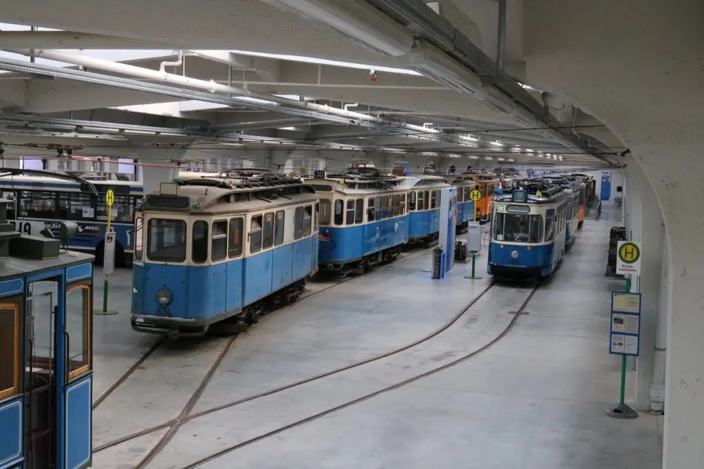 Op zaterdag stond een tramrondrit door de stad op het programma. Op de geplande vertrektijd kwam er een drieasserstel aan. Wij dachten: dat wordt hem, maar tot onze verbazing reed hij de halte voorbij. Enkele minuten later kwam dan toch onze tram, bestaande uit een enkelgelede vierasser met een enkelgelede bijwagen uit 1967. Onderweg stapte ook onze Nederlandssprekende gids in die ons inwijdde in de wetenswaardigheden van de stad. Fotostops stonden op de rol bij het standbeeld van koning Maximilian II (de voorganger van de bekende koning Ludwig II), bij het normaal alleen bij evenementen gebruikte eindpunt Olympiapark (onder de heuvels aldaar blijkt oorlogspuin te liggen) en op de Karolinenplatz. Rond één uur werden we bij het Hauptbahnhof afgezet en reden we met lijn 18 naar het MVG-trammuseum, gevestigd in een deel van de gebouwen van de hoofdwerkplaats van de MVG. Er staat een aardige verzameling trams en bussen opgesteld, alsmede de kop van een metrostel. Hier kregen we twee rondleiders mee die ons het een en ander vertelden over de historie en de techniek. Buiten stond nog een driedelige Aveniotram die nog steeds niet is toegelaten op het net waar de twee- en vierdelige inmiddels wel volop worden ingezet. Zondag was een vrije dag. ’s Morgens ben ik naar de Frauenkirche geweest, de grote kerk vlakbij het Rathaus. Dat is de kathedraal van het aartsbisdom München-Freising. Om 12 uur gingen de poppen aan het dansen in de toren van het Rathaus. ’s Middags heb ik enkele tramlijnen bereden waaronder lijn 12. Hierop rijden de kleine Avenio’s.