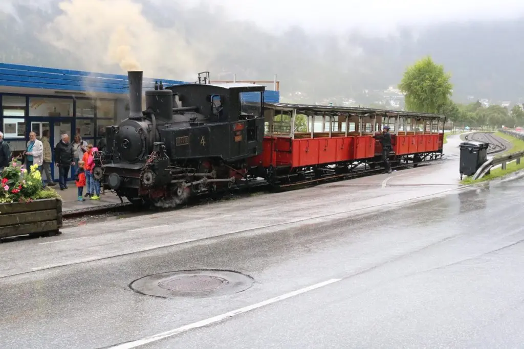 ![]() Het treintje van de Achenseebahn met loc 4 aangekomen op station Seespitz bij de aanlegsteiger van de boot. Ondanks de regen zijn de wagentjes open, 2 september 2019. Foto: Hans Krijnen. |