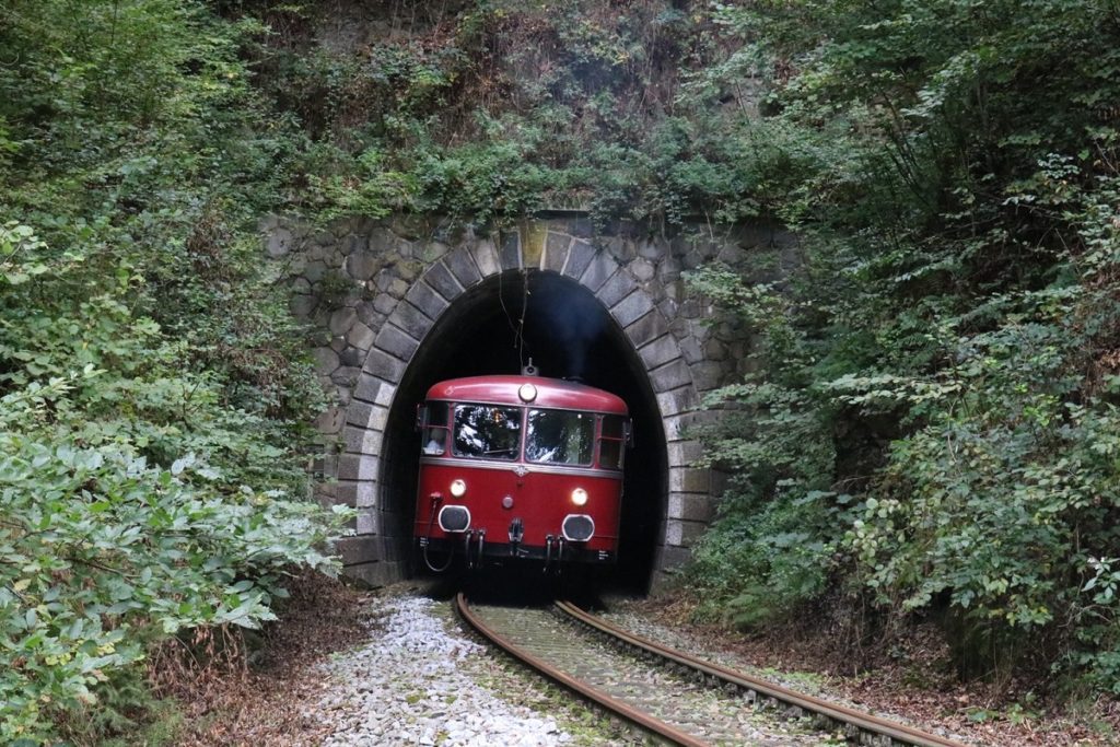 ![]() De Uerdinger railbus van de Passauer Eisenbahn Freunde tijdens een fotostop bij één van de tunnels in de Ilztalbahn, 6 september 2019. Foto: Hans Krijnen. |