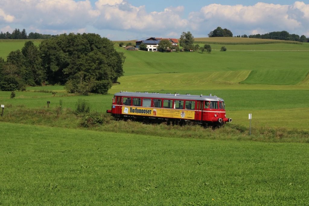 ![]() Fotostop in het glooiende Beierse land met de MAN-railbus van LEO, 3 september 2019. Foto: Hans Krijnen. |