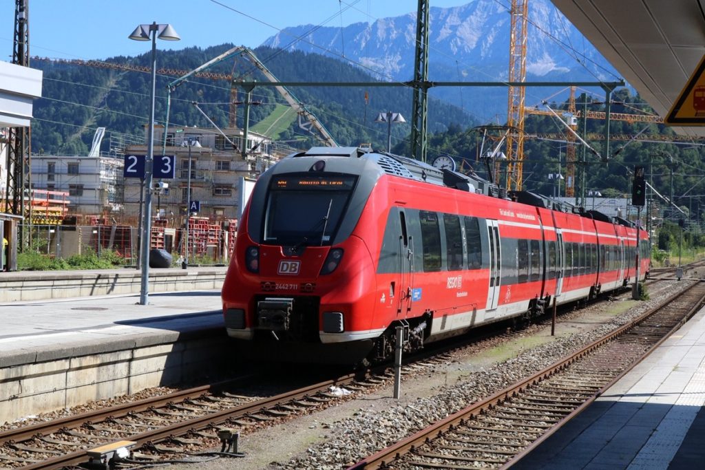 ![]() Een Talent 2-vierwagenstel serie 2442 in Garmisch-Partenkirchen met links op de achtergrond de bekende skischans, 4 september 2019. |