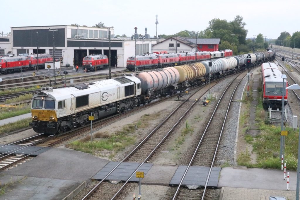 ![]() Een class 77-dieselloc van Euro Cargo Rail komt station Mühldorf binnen met een ketelwagentrein. Op de achtergrond het diesellocdepot van Mühldorf, 5 september 2019. Foto: Hans Krijnen. |